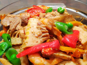 今回はアクヌキの後、鶏肉、エビ、パプリカ等をオリーブ油で炒めました😁