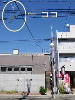 翌日ふと気が付くと店の前の電線にビニール傘がぶら下がってました。