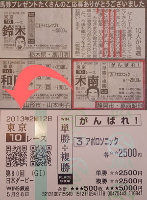 でもやっぱり気になります。当日の昼ごろは出先でしたがTVのある前に座り込み観戦したら本命は3位だったのでガッカリでしたが、よく見ると副賞って言うのを買ってあり3位以内はアタリ!