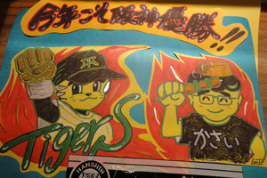 「アピールすること考えておいて!」ということだったので私の大好きな阪神タイガースを応援することにして応援のPOPも作り、(写真:下)応援グッズも並べて取材されました。
