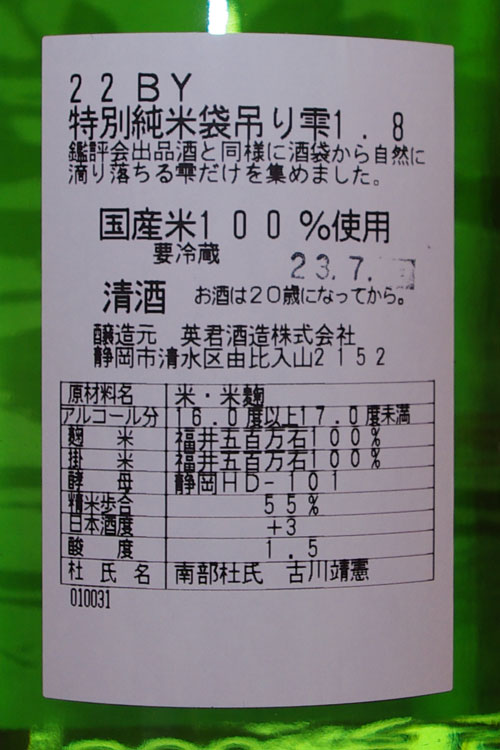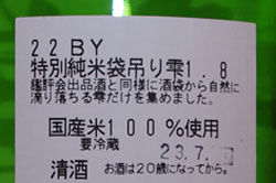 特別純米酒なのに"袋しぼり"と言って圧縮の機械を使わずに自然の力でタラタラと落ちたお酒の方がシャープな味わいになります。(吟醸酒がこの類です)