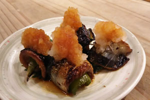 今年のサンマは脂があって美味しくて評判がいいです。サンマは炭焼きも美味しいんですけどちょっと変化球でサンマのロール焼きを合わせてみましょう。