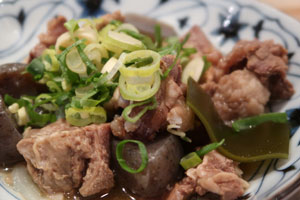 牛すじを吸った昆布がすごく美味しくなっています。それから玉コンニャクも味が染みて美味しくなっていますので、九条ネギをどっさりかけて召し上がってください!