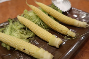 焼いた後のヒゲをひとまとめにお出ししていますが、ヤングコーンよりもこのヒゲの方が美味しいというお客様やヒゲだけ食べたいというお客様もいらっしゃいます。