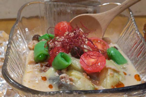 ナスは夏で火照った体の熱を取る ほか、ゴマのスープは身体にいいという事で夏にぴったりのお料理です。